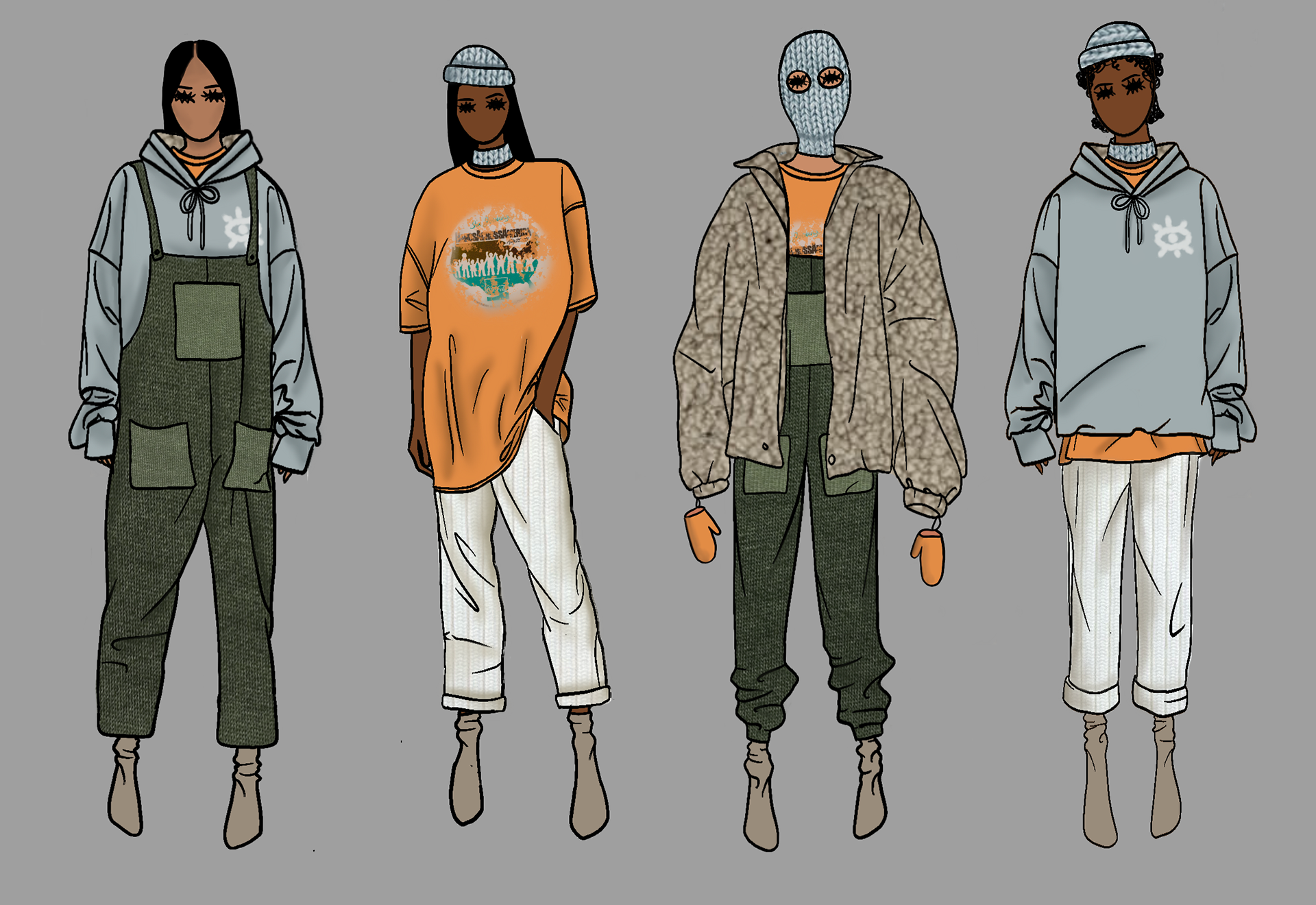 The line that was created is centered around the idea of there being both a polar vortex and a pandemic outbreak happening at the same time. The clothing in the line is meant to be comfortable while also offering protection against the harsh outside weather and the illness that is going around getting people sick. The mix of knits offer a warm outfit in both the inside and the outside looks, while the option for face and hand covering helps prevent against the virus that is being passed along. Every item in the line can be worked either inside or outside, just depending on the layering between the pieces. Obviously the jacket is the warmest garment, while the shirt is meant for almost always layering. The gloves and convertible ski mask (not included in the simulations and pattern making) are there to provide protection both against the cold, and the virus, in the outside outfits, but can also be worn as accessories while inside.